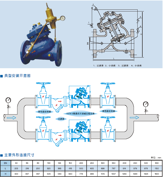 YX741X隔膜可調式減壓穩壓閥是暗安裝于高層建筑給排水系統管道上,將進口壓力減至某一需要的出口壓力的特種閥門。該閥門依靠本身能量使出口壓力保持穩定在設定直,即出口壓力不因進口壓力及流量的變化而變化,并且閥門控制系統的進口處裝有一個自清潔濾網,利用流體特性,使比重較大、直徑較大的懸浮顆粒不會進入控制系統,確保系統循環暢通無阻,使用門能安全可靠地運行。系統動作靈敏,使用壽命長。