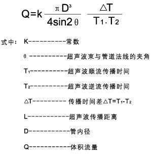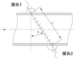 當(dāng)超聲波在液體中傳播時(shí),探頭1發(fā)射的超聲波脈沖被探頭2所接收,同時(shí),探頭2也發(fā)射超聲脈沖,探頭1接收,則順流方向聲波傳播速度會(huì)增大,逆流方向則減小,同一傳播距離就有不同的傳播時(shí)間,利用傳播時(shí)間之差與被測(cè)流速之關(guān)系求取流速,進(jìn)而得出流量,其關(guān)系式如下: |