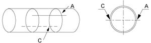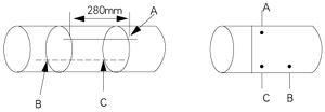 | 從A點(diǎn)開(kāi)始,沿著定位紙邊邊緣量出管道1/2周長(zhǎng),該點(diǎn)為C,在C點(diǎn)劃一條與定位紙邊緣垂直的直線; |