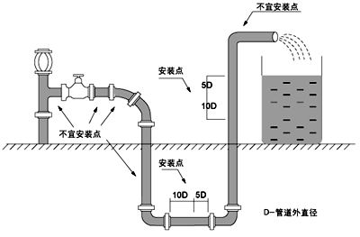 ● 應(yīng)安裝在水平管道較低處和垂直向上處,避免安裝在管道的高點(diǎn)和垂直向下處 |