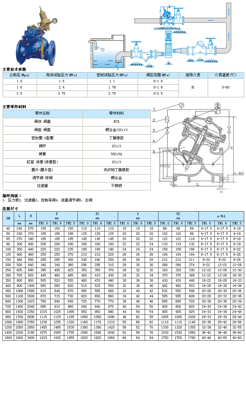 工作特點1、壓力控制穩(wěn)定可靠。導閥、主閥連續(xù)工作,下游壓力變化連續(xù)、平穩(wěn),受進口壓力影響小。2、操作方便。工作壓力調(diào)定后,當上游壓力或流量變動時主閥自動調(diào)節(jié),穩(wěn)定了下游壓力。3、閥體采用了全通道、直流式、流線型設(shè)計。水力損失小,節(jié)能效果好。