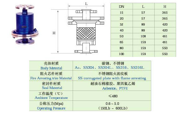 詳細說明: ① 阻火器適用于儲存閃點低于28℃的甲類油品和閃點低于28℃的乙類油品,也適用于儲存物料以氮氣封頂的拱頂罐上,礫石阻火器與網型阻火器原理同上,用在管道上。 ②與呼吸閥、呼吸人孔配套使用,也可單獨使用。