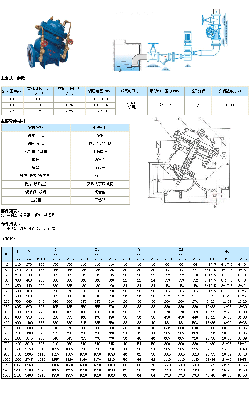 本產(chǎn)品由主閥和調(diào)節(jié)閥及接管系統(tǒng)組成,閥體采用直流式閥體,主閥控制室為膜片式或活塞式的雙控制室結(jié)構(gòu),控制室比一般水力控制閥增加了一個(gè),增加了對主閥的控制功能,實(shí)現(xiàn)了對水泵出口的緩慢開啟、全開、緩閉、截止等多功能控制,實(shí)現(xiàn)了一個(gè)閥門、一次調(diào)節(jié)對水泵出口的多功能控制。