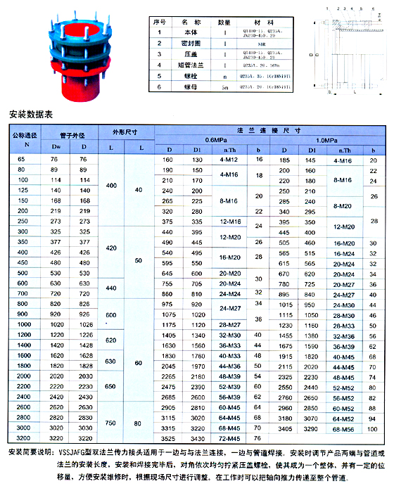 | VASSJAFG型單法蘭傳力接頭CF(VSSJAFG)單法蘭傳力接頭直接與管路焊接,其作用與特點(diǎn)同C2F(VSSJAF)。該產(chǎn)品適用于一邊與法蘭連接一邊與管子連接的管路中,安裝時(shí)調(diào)節(jié)產(chǎn)品兩端與法蘭的安裝長(zhǎng)度,對(duì)角座均勻擰緊壓蓋螺,使其成為一個(gè)整體,并有一定的位移量,方便安裝維修時(shí),根據(jù)現(xiàn)場(chǎng)尺寸進(jìn)行調(diào)整。在工作時(shí)可以把軸向推力傳遞至整個(gè)管道。這樣不僅提高工作效率,而且對(duì)泵設(shè)備起到一定保護(hù)作用。